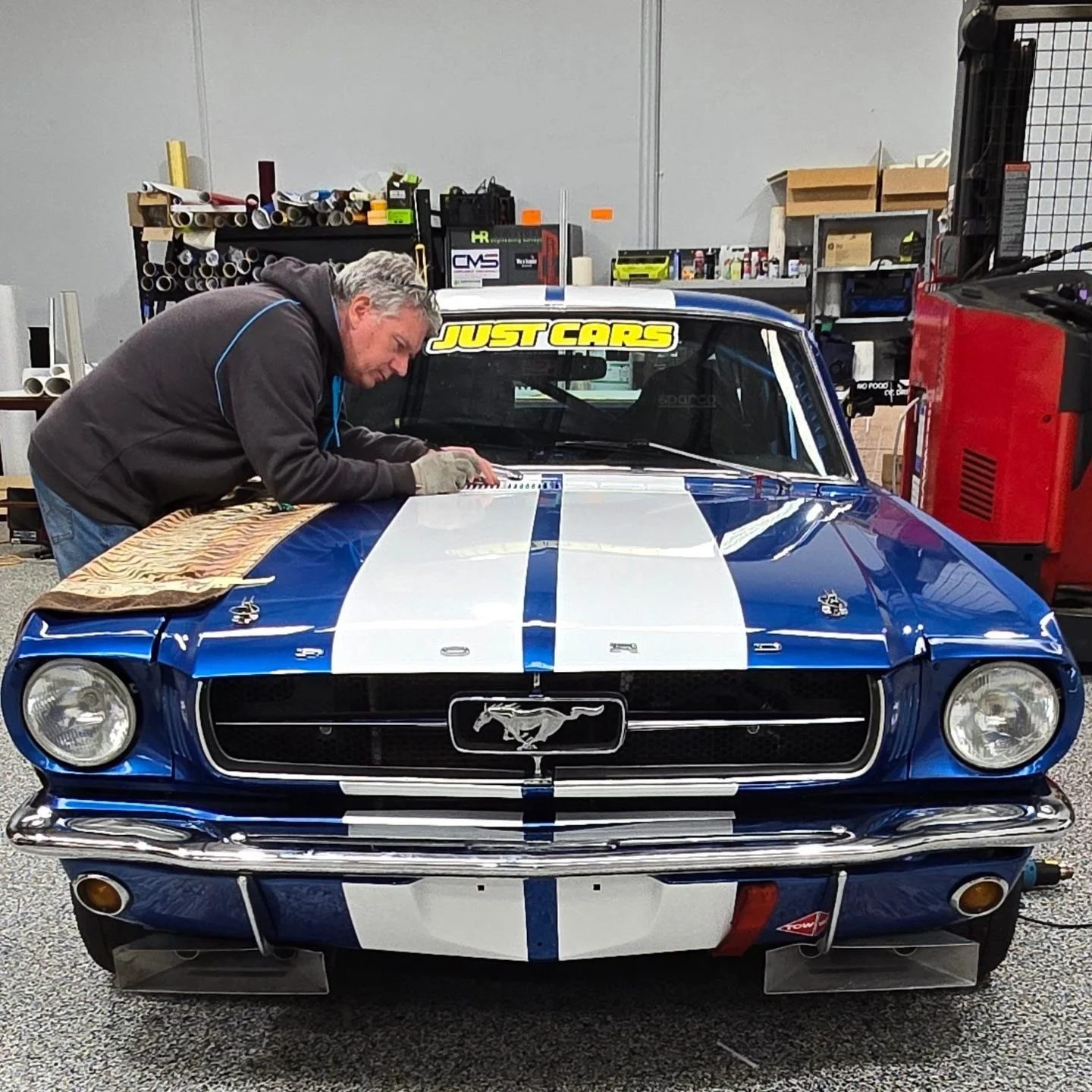 We installed a bold gloss white stripe kit on a historic racing Mustang, with a stunning metallic blue duco finish that really pops.