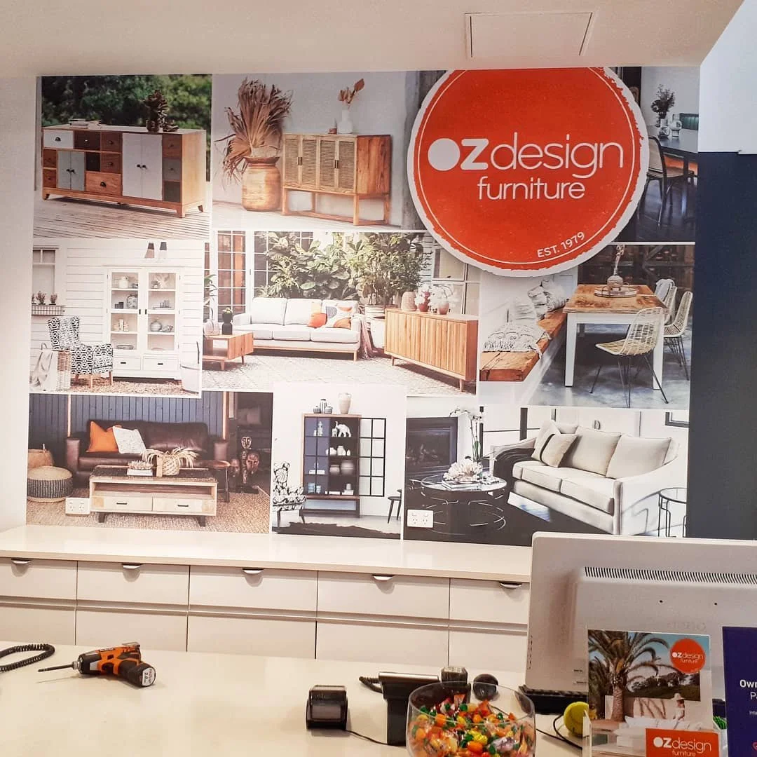 A vibrant wall mural at Oz Design Nunawading, featuring Phototex material with a woven pattern and lustrous finish, installed in three 3-meter sections.