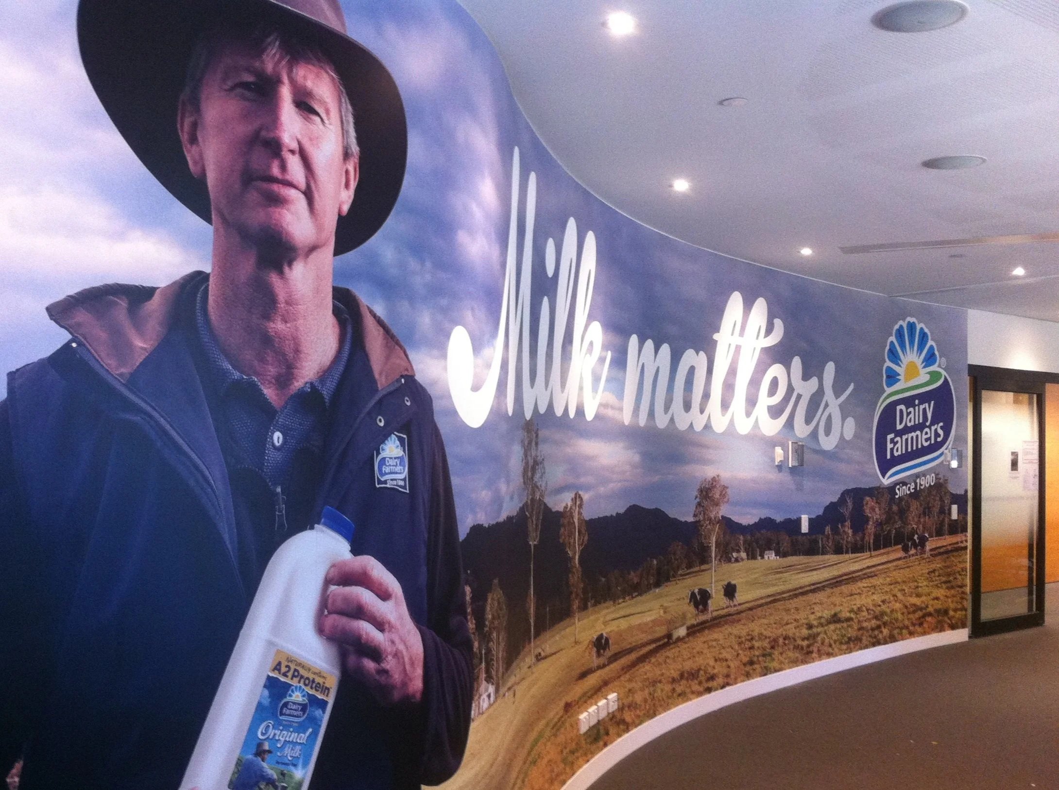 A large curved wall installation for Dairy Farmers, seamlessly vinyl wrapped for a clean, professional finish.