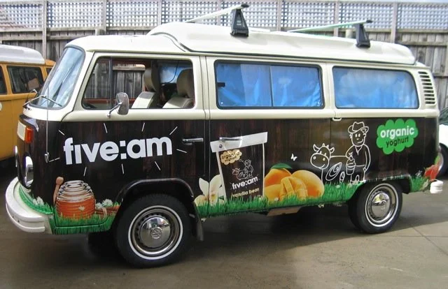 Project fully managed by EXO: transformed an orange Kombi with panel damage to VW Off White, wrapping the body, icebox, and custom-printed curtains.